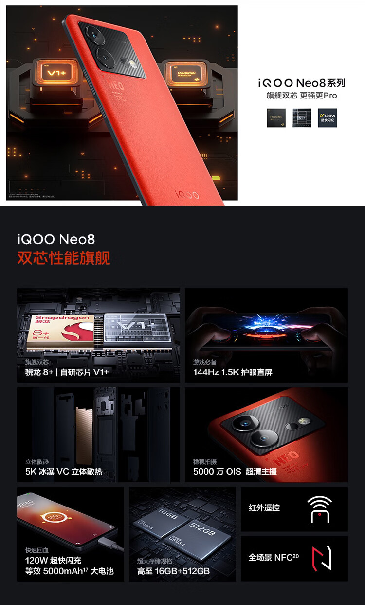 vivo iQOO Neo8 12GB+256GB 冲浪 第一代骁龙8+ 自研芯片V1+ 120W超快闪充 144Hz高刷 5G游戏电竞性能手机